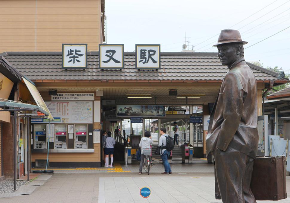 เมื่อมาถึงสถานี ชิบามาตะ สิ่งแรกที่สะดุดตาคือรูปปั้นชายใส่หมวกกับหญิงใส่ผ้ากันเปื้อน ตัวละครเอกจากซีรีส์ญี่ปุ่นระดับตำนาน Otoko wa Tsurai yo ที่มีถึง 48 ภาค บางฉากถ่ายทำกันในย่านนี้ ทำให้ที่นี่กลายเป็นจุดตามรอยของแฟนหนังญี่ปุ่นไปโดยปริยาย