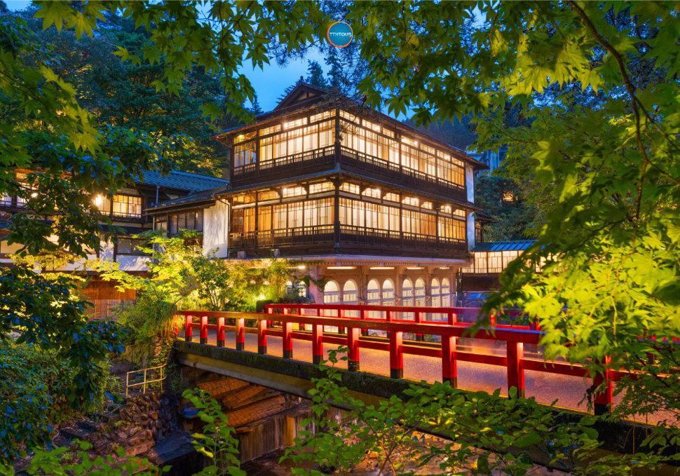 จุดที่ห้ามพลาดคือการเข้าพักที่ เรียวกังเซคิเซ็นคัง (Sekizenkan Ryokan) ที่พักเก่าแก่ หลายคนเชื่อว่าเป็นแรงบันดาลใจของโรงอาบน้ำใน Spirited Away ด้วยสถาปัตยกรรมไม้แบบญี่ปุ่นโบราณ บรรยากาศอบอุ่น ล้อมรอบด้วยธรรมชาติของหุบเขา และสะพานสีแดงที่เป็นมุมถ่ายรูปยอดนิยมที่สุดของเมือง